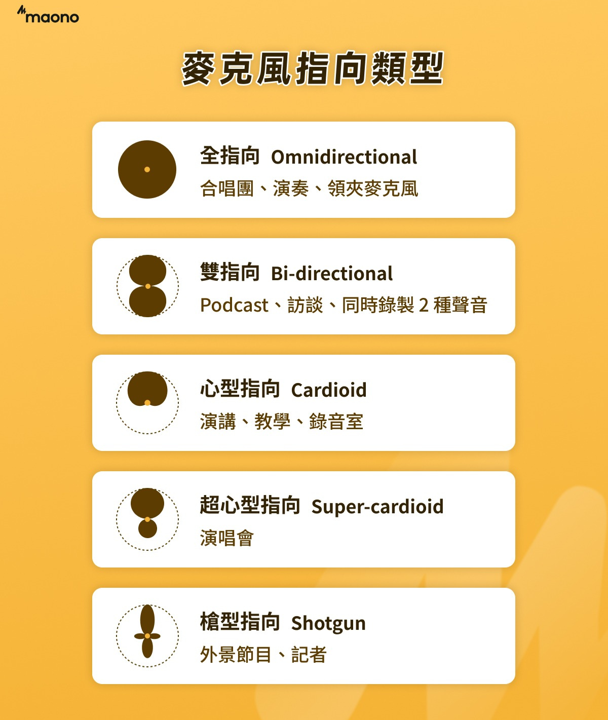 不同指向類型的收音方向、範圍、品質皆有差異,你可以根據錄音環境、內容類型選擇指向,如果是沒辦法控制背景噪音的環境,通常比較適合較通用的心型指向性麥克風。