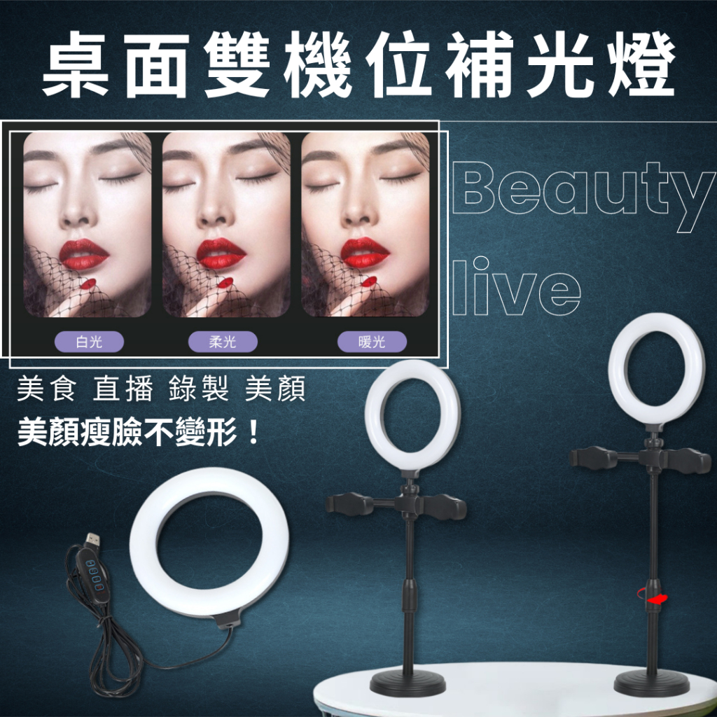 | 產品特色 | 補光與手機架二合一、雙機位切換、360度旋轉調節 |