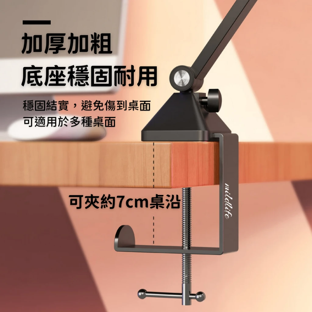 懸臂式設計,可調整高度、角度,輕鬆固定在桌面或架子上,