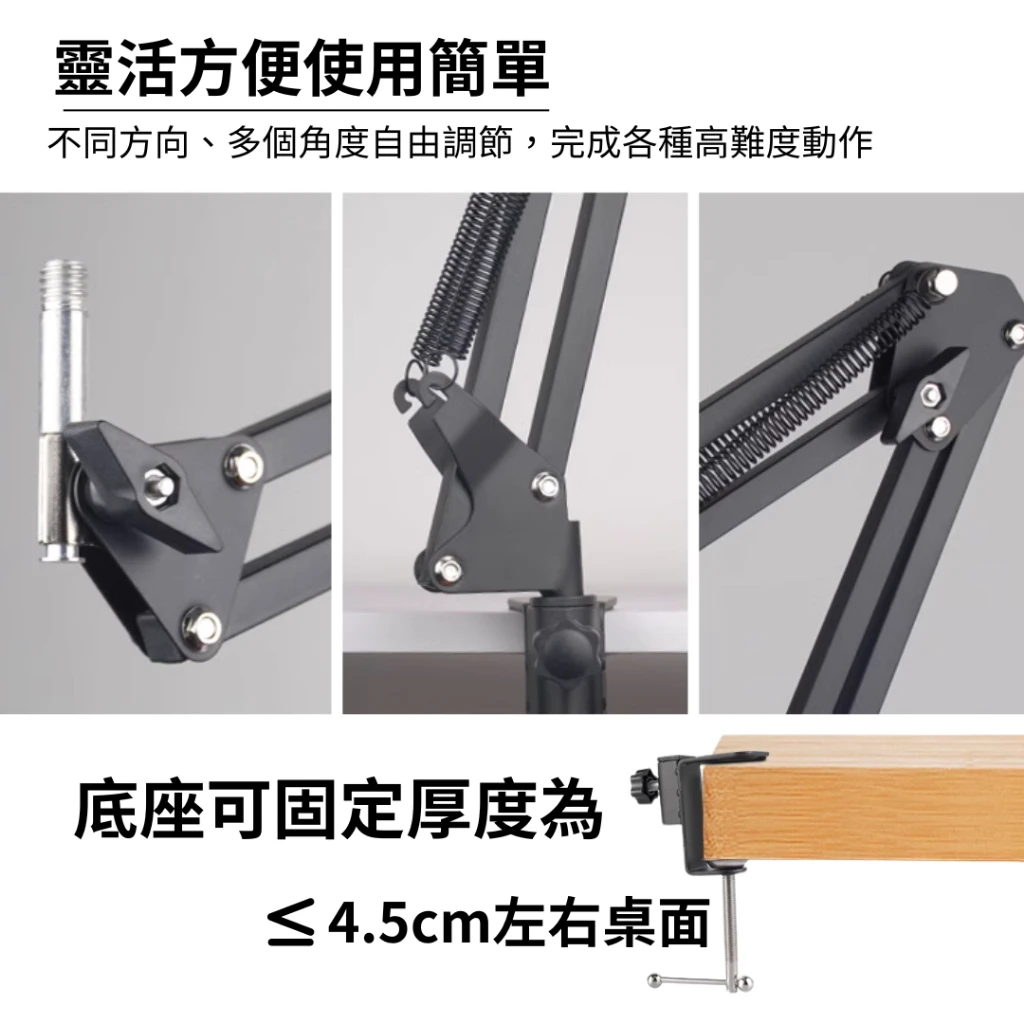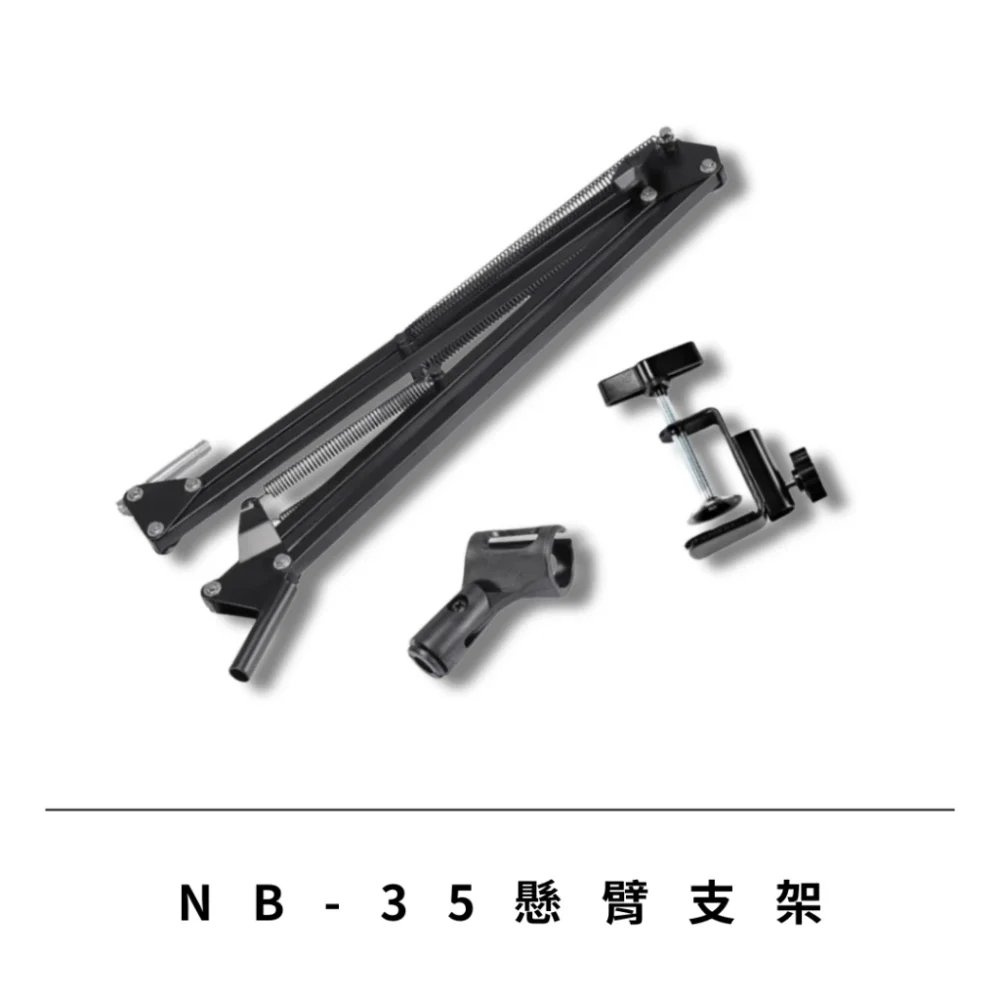 在安裝與相容性方面,產品隨附加固型桌面固定 C 夾,可穩定安裝於不同厚度的桌緣。支架末端採用標準規格螺絲頭,廣泛相容於市面上各類電容麥克風、動圈麥克風及其專屬防震架。無論是入門級的 NB35 或是進階款型號,都具備優異的耐用度與載重平衡表現。這款懸臂支架不僅能提升錄音過程的便利性,更有效避免桌面震動傳導至麥克風,讓您的聲音表現更純淨專業。