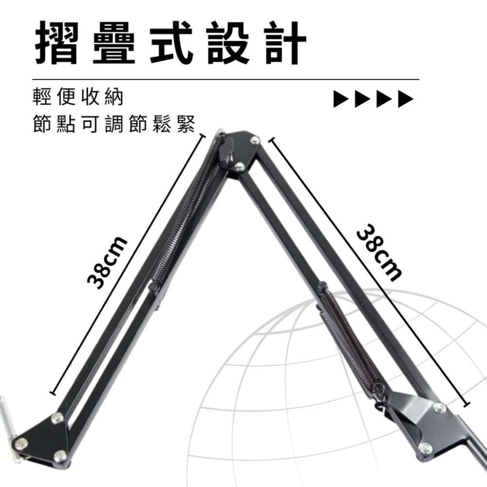 本系列支架採用雙節式懸臂設計,內置強化拉力彈簧,提供極佳的靈活性與支撐力。使用者可以根據桌面空間與收音習慣,輕鬆進行 180 度的垂直調節與 360 度的水平旋轉,確保麥克風始終位在最理想的收音角度。支架折疊式的收納設計,讓您在不使用時能迅速騰出桌面空間,是維持桌面整潔的利器。