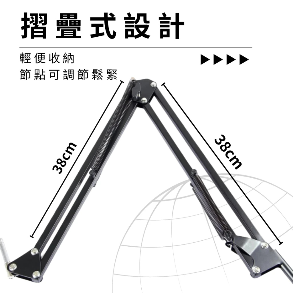 | 支架結構 | 雙臂摺疊設計、輕便收納、節點可調節鬆緊 |