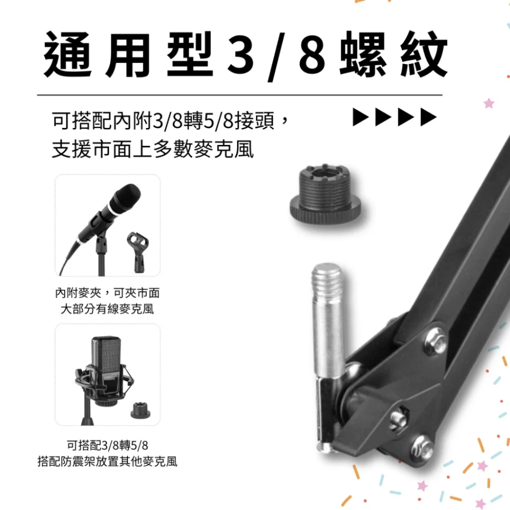 | 接口螺紋 | 支援 3/8 螺紋,麥克風夾接頭也可接防震架 |