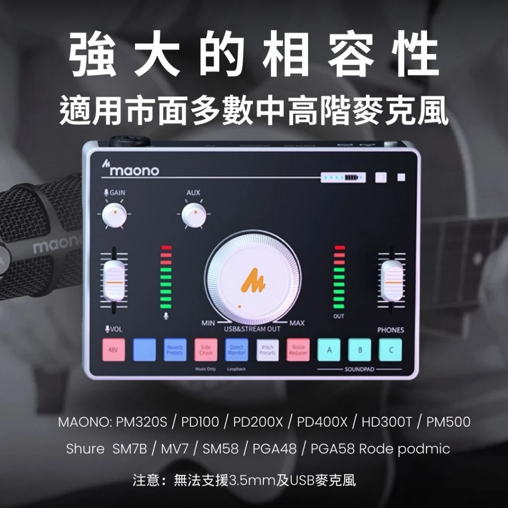 提供對 MIC 音量、MIC 增益、AUX IN、耳機和流輸出的獨立控制。
