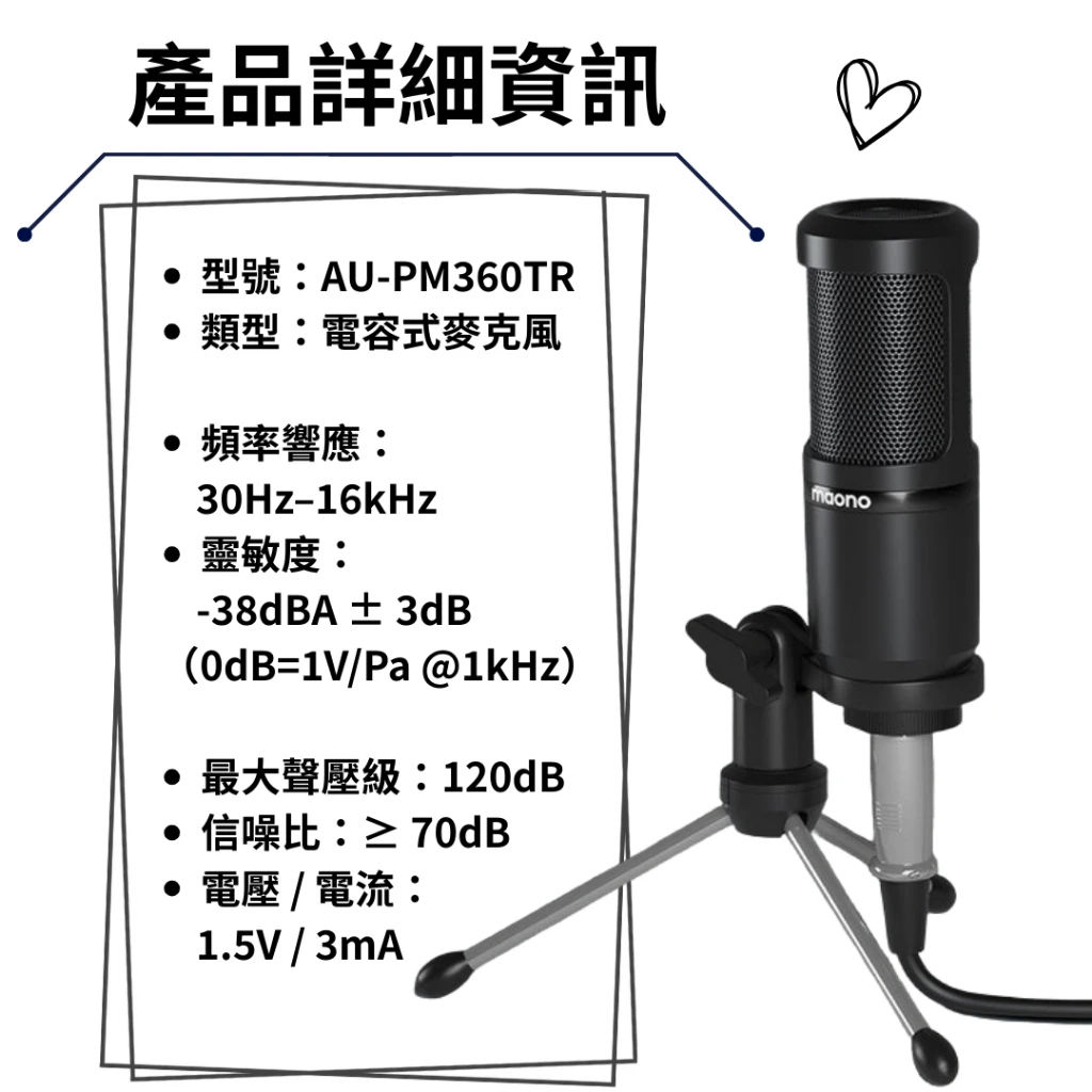 | 產品名稱 | MAONO AU-PM360TR XLR 轉 3.5mm 電容麥克風 |