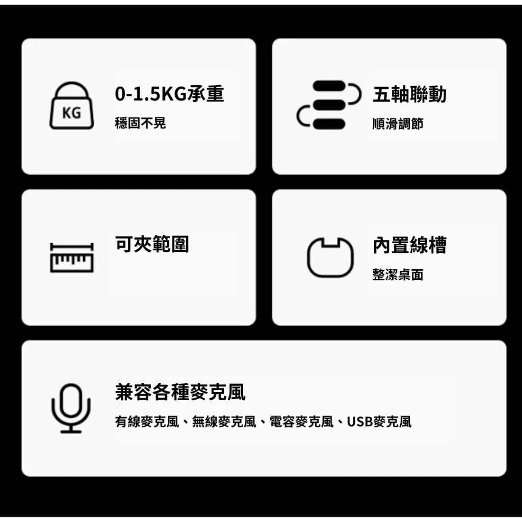 不建議用於超過 2 公斤之大型麥克風或特殊造型支架