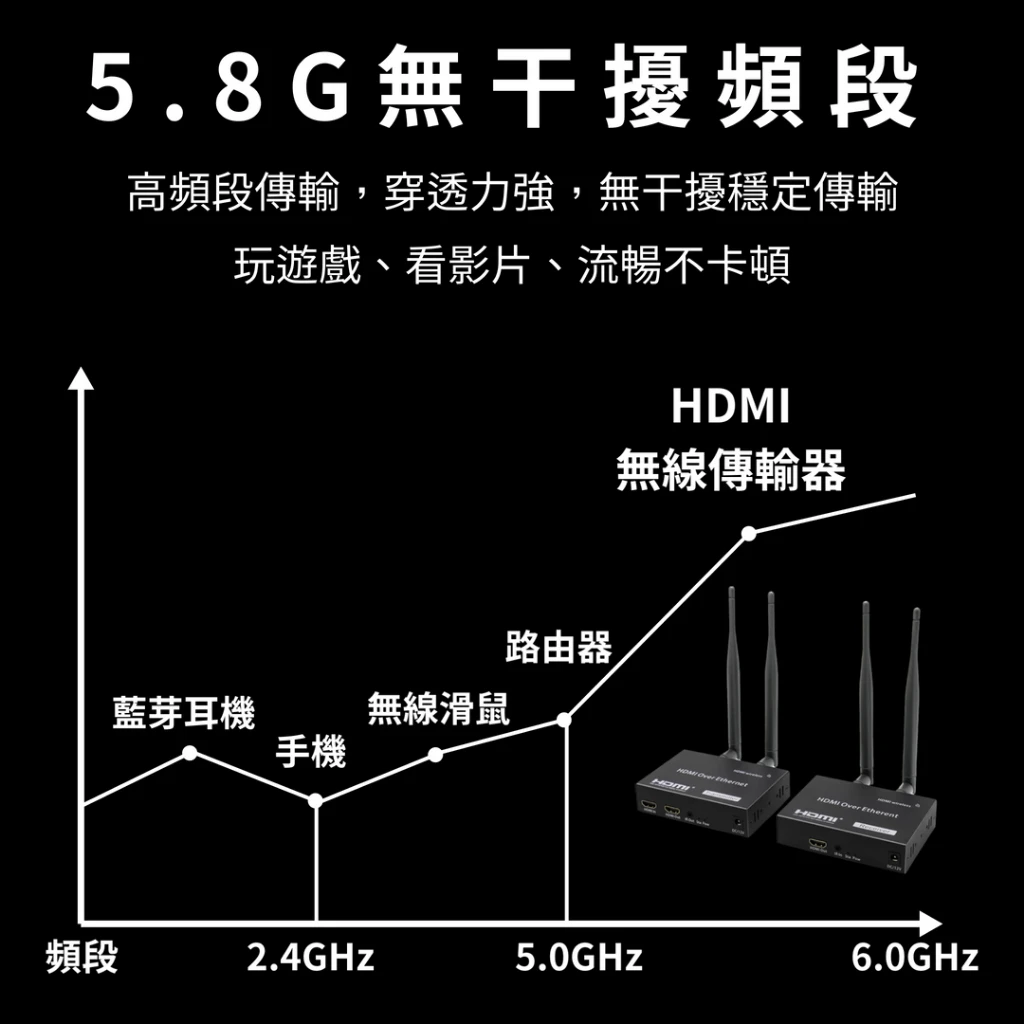 | 無線頻率 | 支援 2.4GHz / 5.8GHz 雙頻傳輸,抗干擾能力強 |