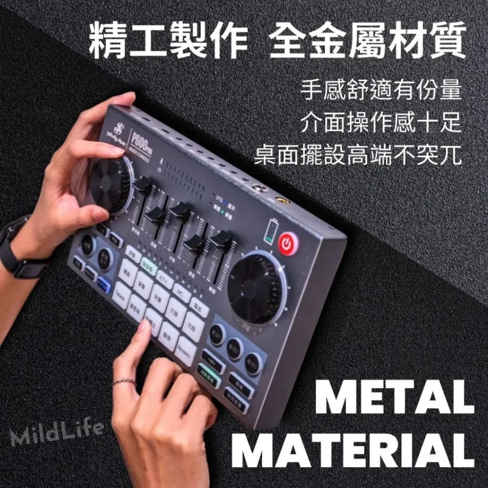 MildLife P600 Pro 聲卡套組是一款定位專業級的旗艦直播設備,旨在為直播主與音樂創作者提供更強大的音訊控制力。本套組完整保留了 P600 Pro 的高級硬體配置,包含大振膜電容麥克風與具備專業推桿的音效控制台,讓您的直播間瞬間具備錄音室水準。