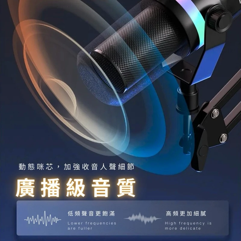 • 內建 全彩RGB燈環,觸控切換燈光模式,讓你的直播間更具科技感。