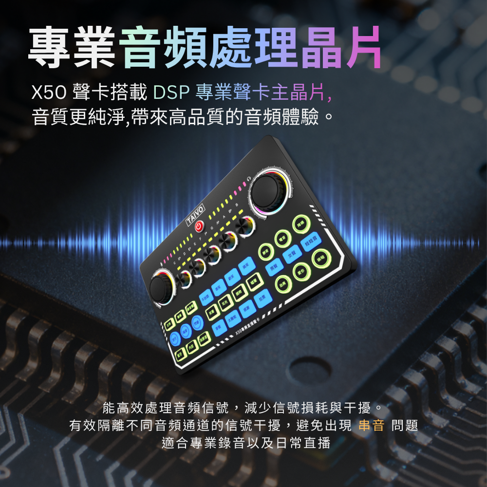 TAIVO X50 聲卡搭載 DSP 音頻處理晶片,音質純淨細膩、即時反饋低延遲,完美應對各類直播、錄音、K 歌與教學場景。